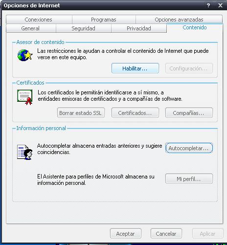 Selecciona “Opciones de Internet” y la pestaña “Contenido”.